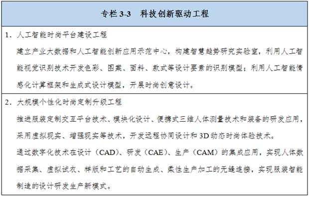 2.加快纺织时尚柔性制造的模式升级。构建以数字化、智能化、柔性化技术为核心的时尚制造体系,促进以建模仿真、立体编织、3D打印等为代表的新型制造技术与时尚产品的跨界融合发展;紧跟流行趋势和消费需求,以小批量、短周期的生产模式实现适时、灵活、便捷、快速响应的定制生产。