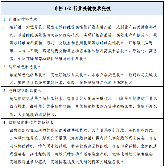 1.加强关键技术突破。深入实施创新驱动发展战略,打造纺织行业原创技术策源地。重点围绕纤维新材料、纺织绿色制造、先进纺织制品、纺织智能制造与装备等四个领域开展技术装备研发创新,补齐产业链短板技术,实现产业链安全和自主可控,强化行业关键技术优势,注重原始创新,加大基础研究投入,带动全产业链先进制造、智能制造、绿色制造能力逐步达到国际先进水平。