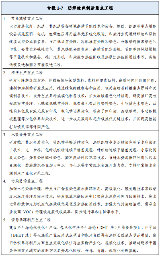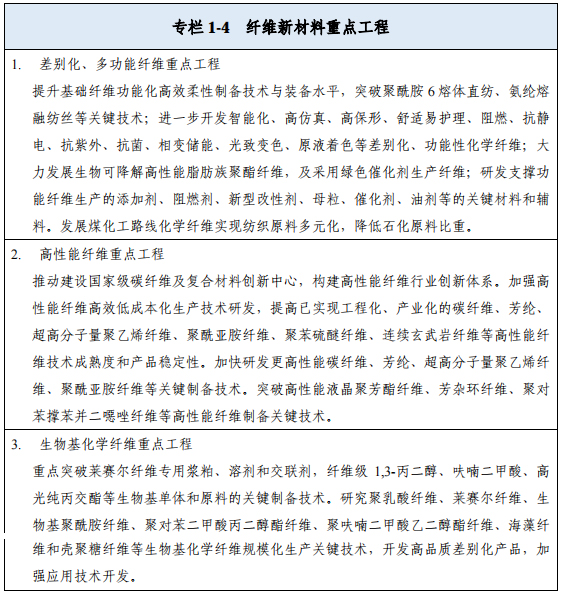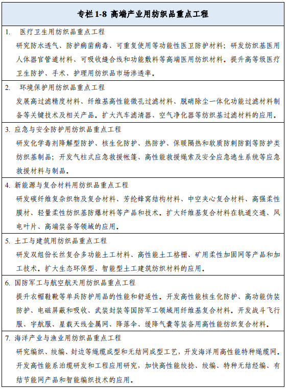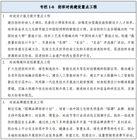 在纤维新材料、智能制造、时尚建设、绿色制造、高端产业用纺织品共五个领域实施一系列重点工程,具体落实“十四五”时期实施转型升级高质量发展的重点任务。